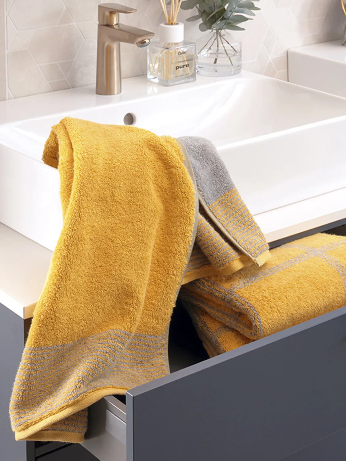 Coppia asciugamani in spugna di puro cotone composta da asciugamano viso + ospite colore two tone senape. Il tessuto di questi asciugamani è super confortevole, mentre il design sarà davvero elegante in qualsiasi bagno.