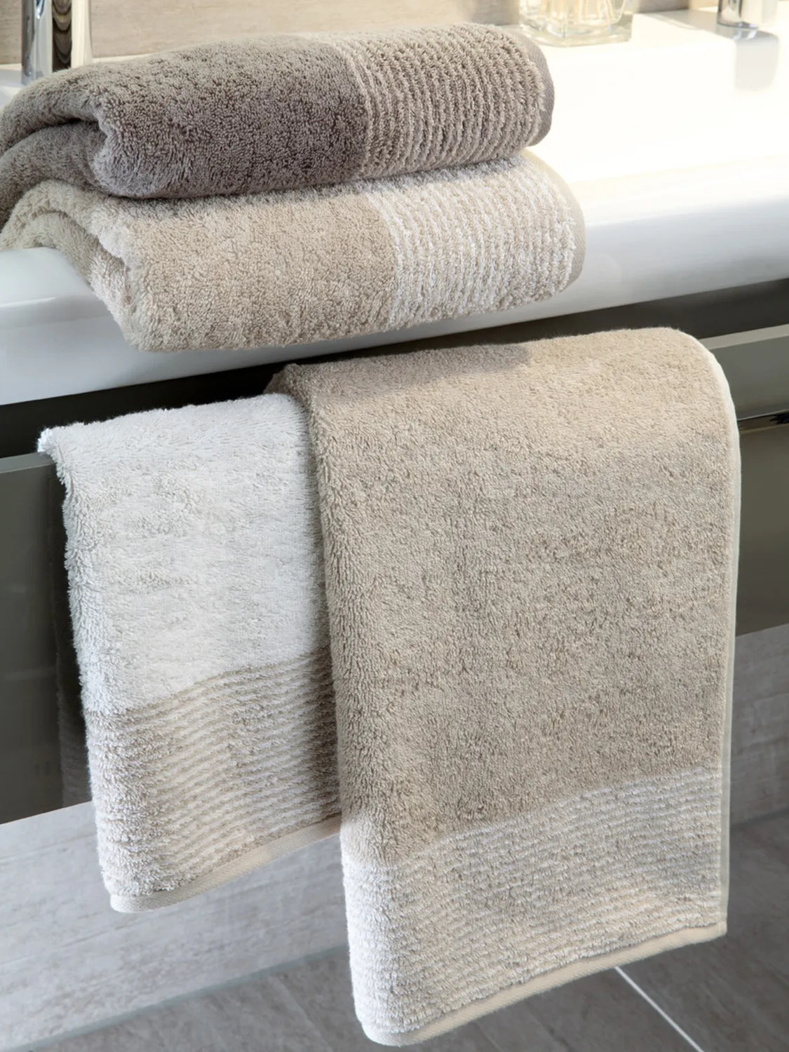 Coppia asciugamani in spugna di puro cotone composta da asciugamano viso + ospite colore two tone verde sabbia. Il tessuto di questi asciugamani è super confortevole, mentre il design sarà davvero elegante in qualsiasi bagno.