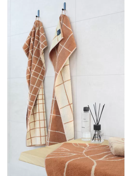 Coppia asciugamani in spugna di puro cotone composta da asciugamano viso + ospite colore Atelier Ruggine. La spugna di questi asciugamani è super morbida e confortevole, così come la lavorazione jacquard davvero elegante.