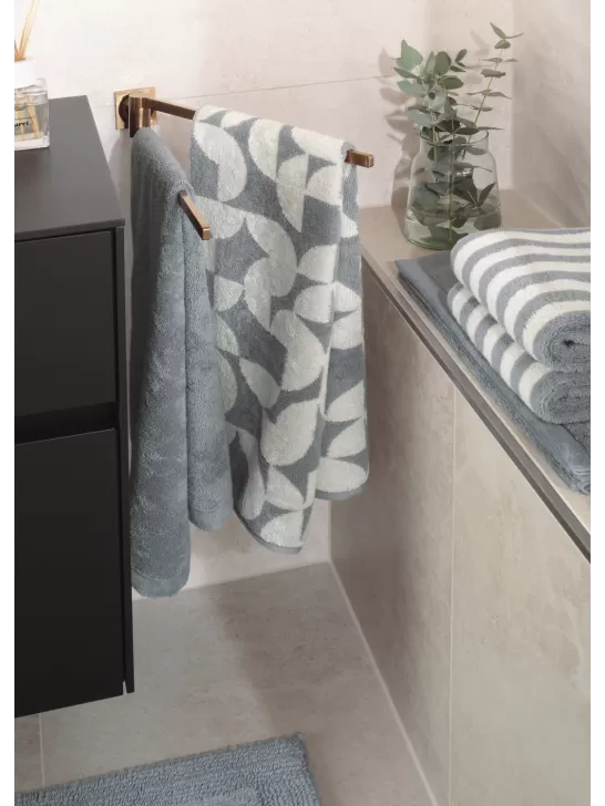 Questo set asciugamani da bagno è realizzato al 100% in spugna di puro cotone di alta qualità. L'asciugamano viso è disponibile in due varianti con motivo a Righe o con motivo geometrico
