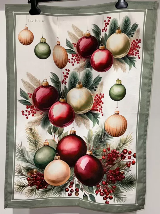 Porta la magia del Natale nella tua cucina con lo strofinaccio da cucina natalizio della serie Addobbi, realizzato in 100% cotone di alta qualità.