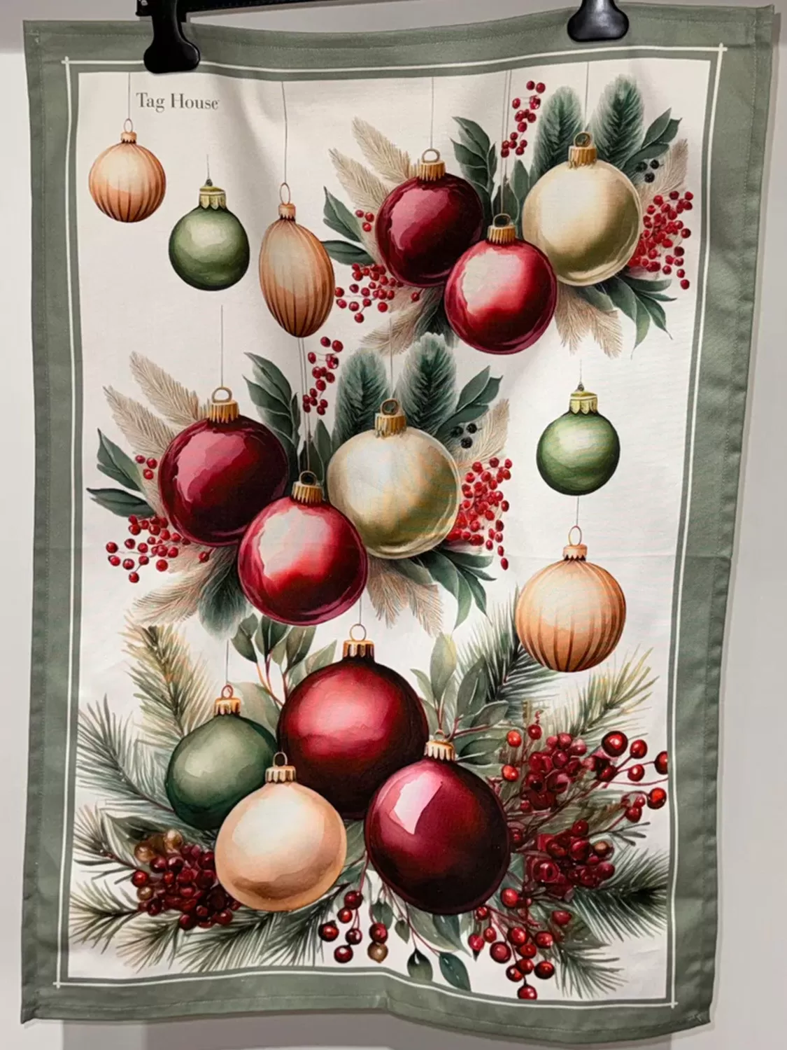 Questo strofinaccio ha una stampa digitale raffigurante un elegante addobbo natalizio che lo rende perfetto anche come idea regalo.