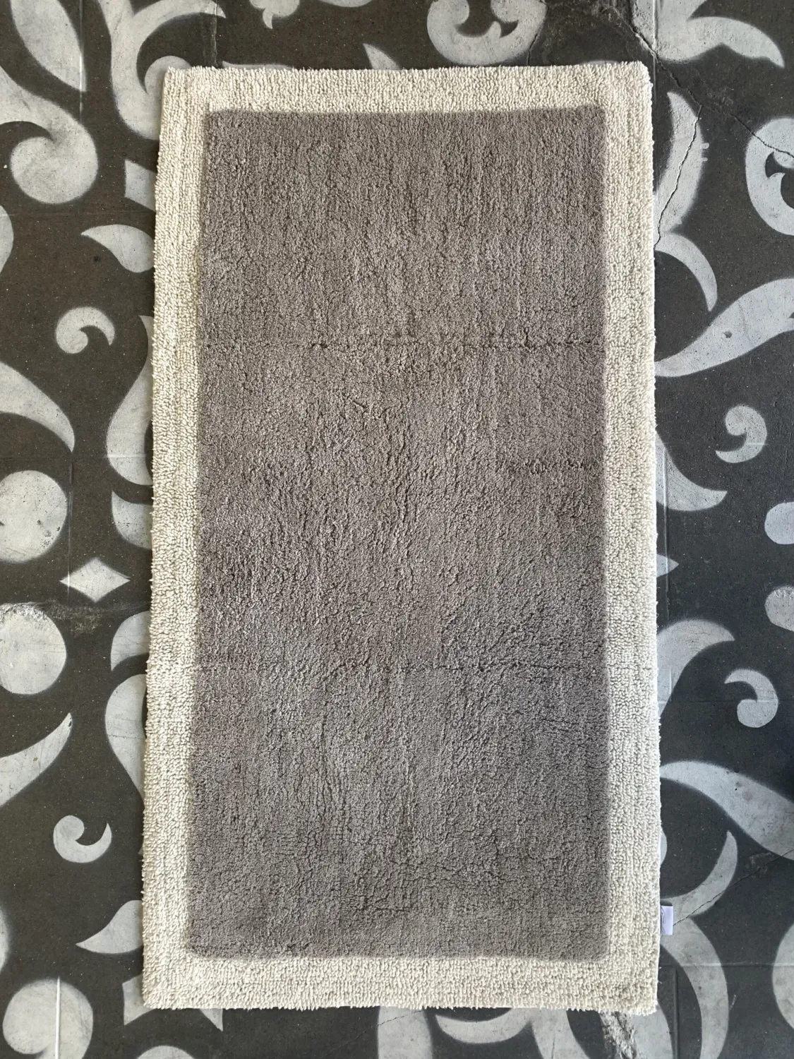 Tappetino per il bagno tinta unita sabbia con cornice disponibile in due misure: 60×90 cm e 70×130cm.
